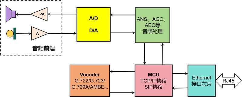窄帶SIP電話方案原理如下圖所示。音頻處理部分自帶ANS(背景噪聲抑制)、AGC(自動增益補償)、AEC(回聲消除)等多種處理算法;MCU采用高性能嵌入式處理器,高速穩(wěn)定、操作流暢;搭配大內(nèi)存,可實現(xiàn)呼出/呼入通話記錄、聯(lián)系人存儲等多種功能。聲碼部分支持G.722、G.723、G.729A、AMBE、AHELP等多種類型的數(shù)字聲碼器。